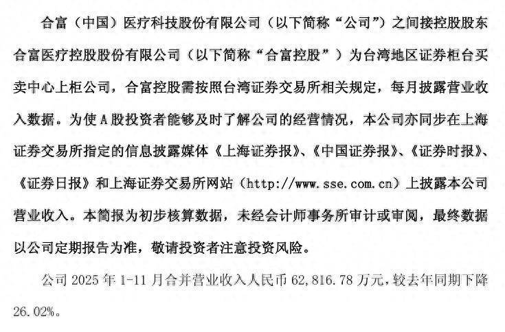 12月10日,合富中国(603122)发布公告,公司2025年1~11月归拢营业收入为6.28亿元,较旧年同时着落26.02%。